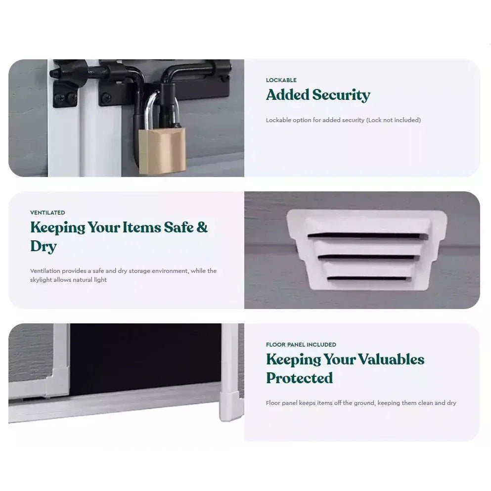 The Manor is a durable storage shed with a double wall construction that is fully weather-resistant. It also features double doors for easy access, floor panel, built-in ventilation for safety, a fixed window for natural light and has a locking system to provide added security for your items.