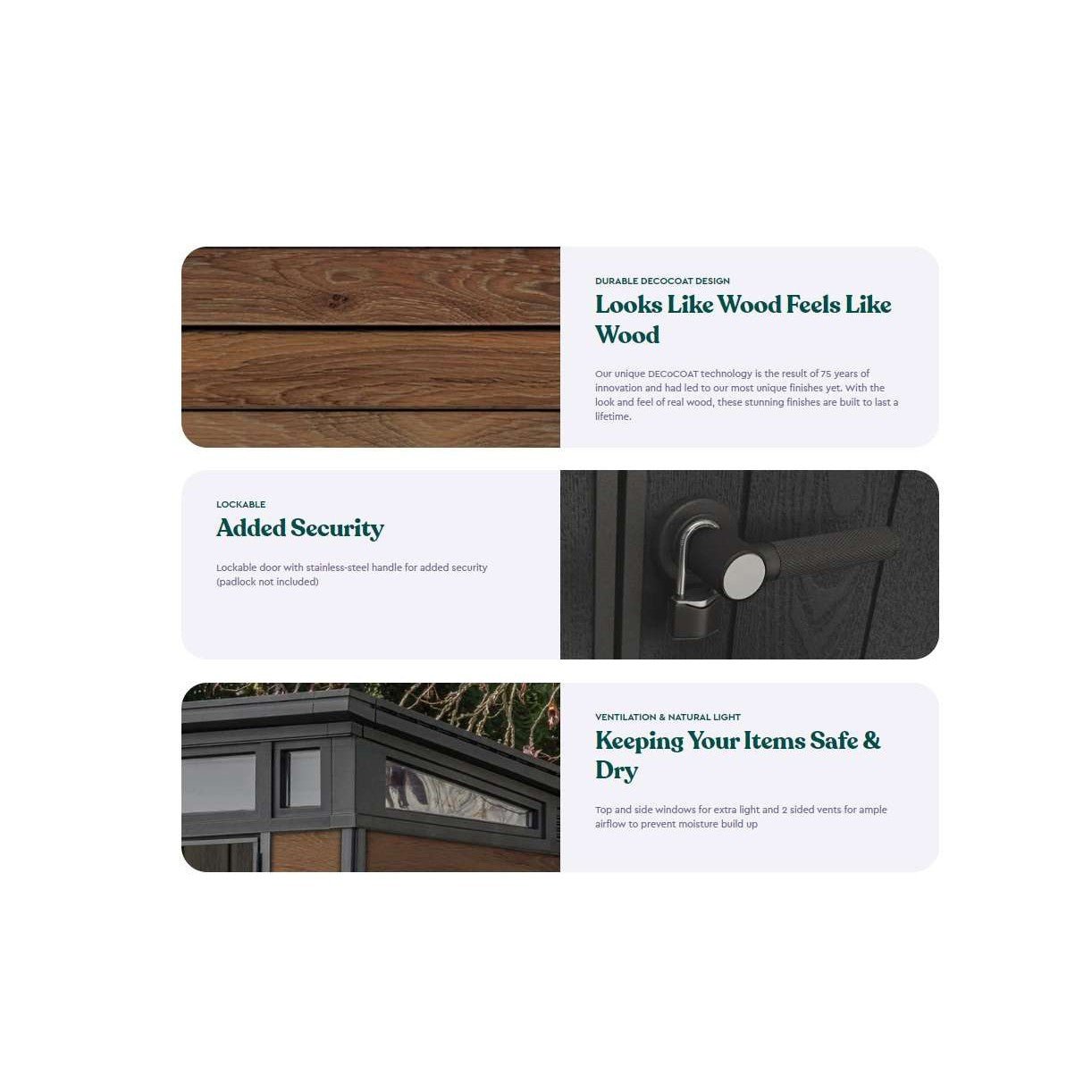 Its double layered walls are made from DecoCoat, an innovative composite material that provides the look and feel of real wood while being extremely durable and completely weather resistant and maintenance free – it won’t rust, rot or peel.