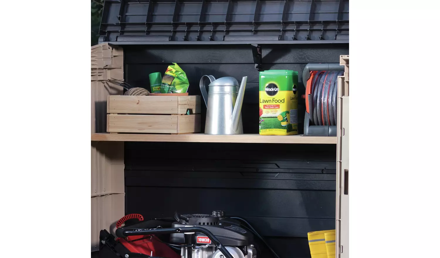 Equally at home indoors or outside, the Store-It-Out MIDI gives you 880L of well-ventilated storage space. From storing your bins to protecting you gardening equipment from the elements, this Keter 880L storage box is the perfect addition to any garden. It opens from the top or from the front with its classic look wood-textured doors, and is lockable for complete security. It even has a sturdy built-in floor panel to keep your items clean and dry and a built-in support for a shelf (shelf not included). With the Store-It-Out MIDI, it’s easy to keep your items secure yet accessible.