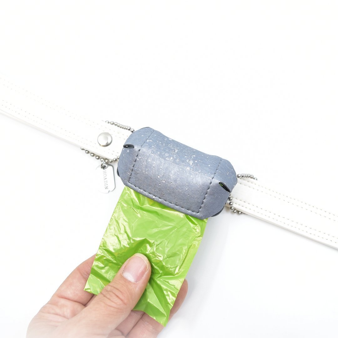 Our Silver Poop Bag Holder is the perfect leash accessory, giving you quick access to those important bags.  Handcrafted in our Connecticut studio with eco-friendly, cork leather  in shimmery gray and able to hold a standard roll of your favorite biodegradable poop bags. It comes with 2 chains. The 2nd is to use as a spare or to secure the bottom to keep it from swinging.